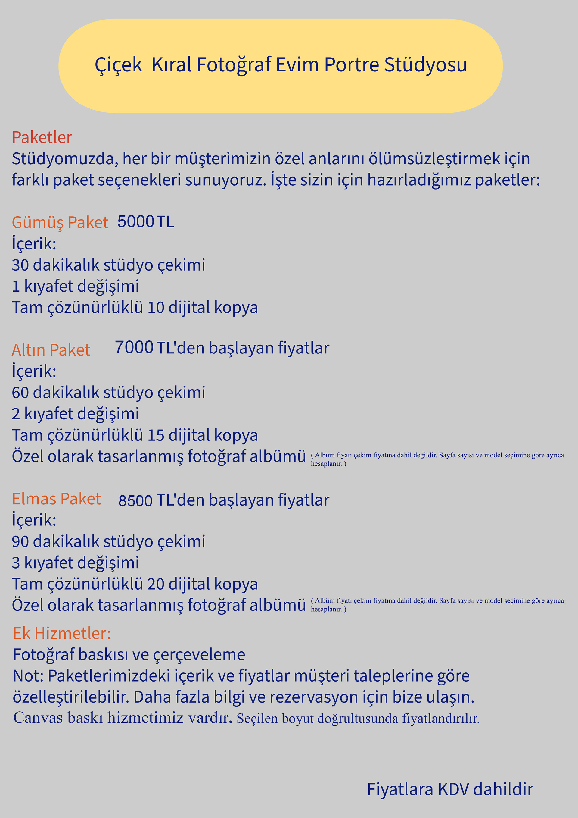 Çiçek Kıral Fotoğraf Evim olarak, sanatın ve hikayenin kesiştiği noktada, her bir portreyle benzersiz anlar yaratmayı amaçlıyoruz. Portre fotoğrafçılığındaki tutkumuz, sizin en doğal ve etkileyici hallerinizi yakalamak üzerine kurulu. Stüdyomuzda, zamanı durduruyor ve ölümsüz anlar yaratıyoruz.