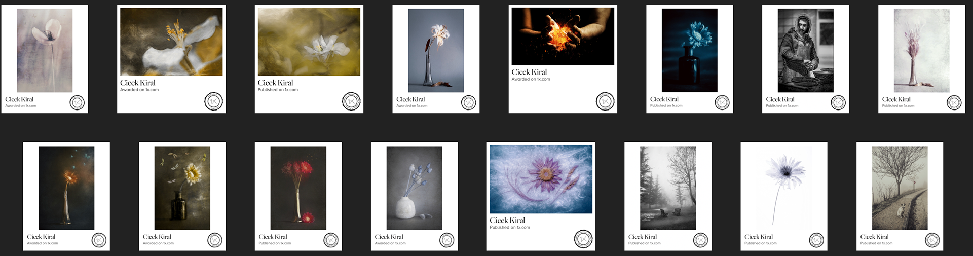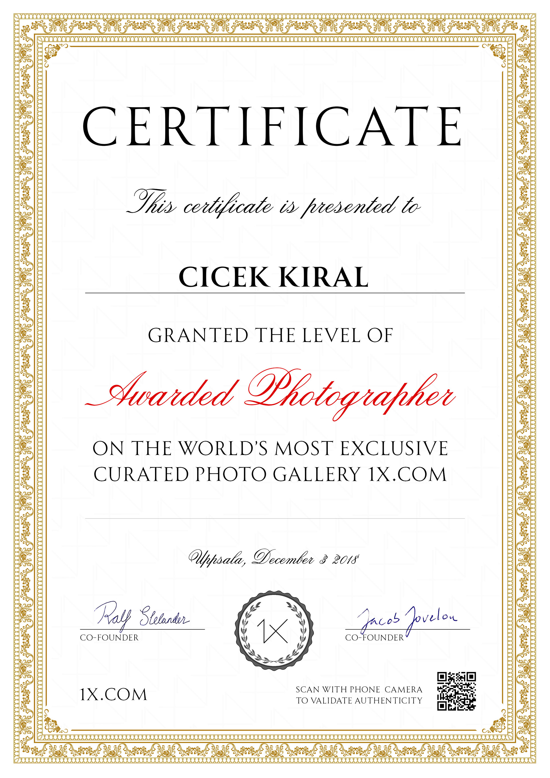 1x.com, dünya çapında fotoğrafçılar tarafından yüksek kalite ve seçicilik standartlarıyla tanınan, prestijli bir sanat platformudur. Bu platform, her bir eserin benzersiz bir hikayesi olduğuna ve her kadrajın bir sanat eseri olarak ele alınması gerektiğine inanarak, yalnızca en üst düzeydeki fotoğrafları sergiler. 1x.com'dan aldığım sertifikalar, çalışmalarımın uluslararası arenada tanınmış ve takdir edilmiş olduğunun bir göstergesidir.